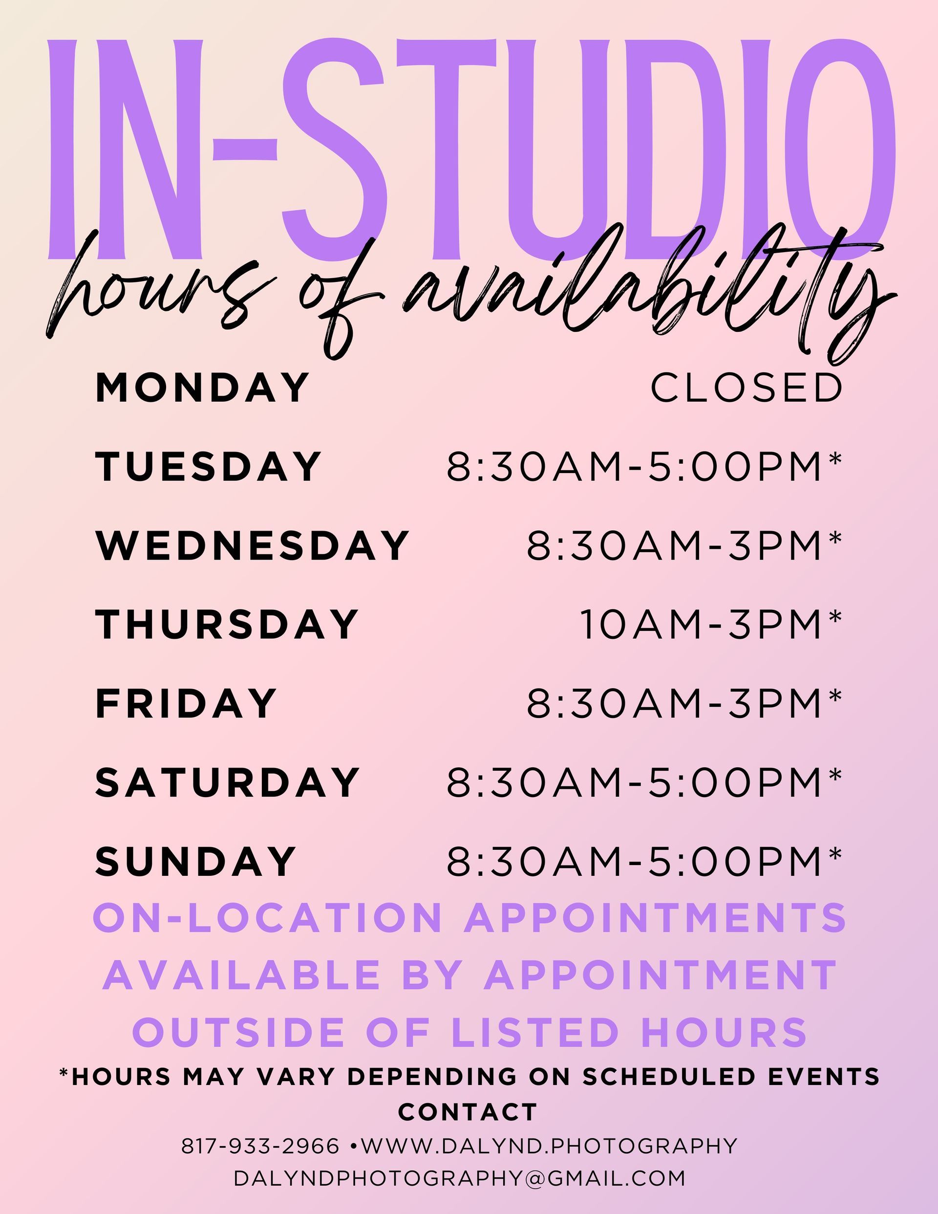 🌿 On-location sessions available by appointment outside of listed hours.