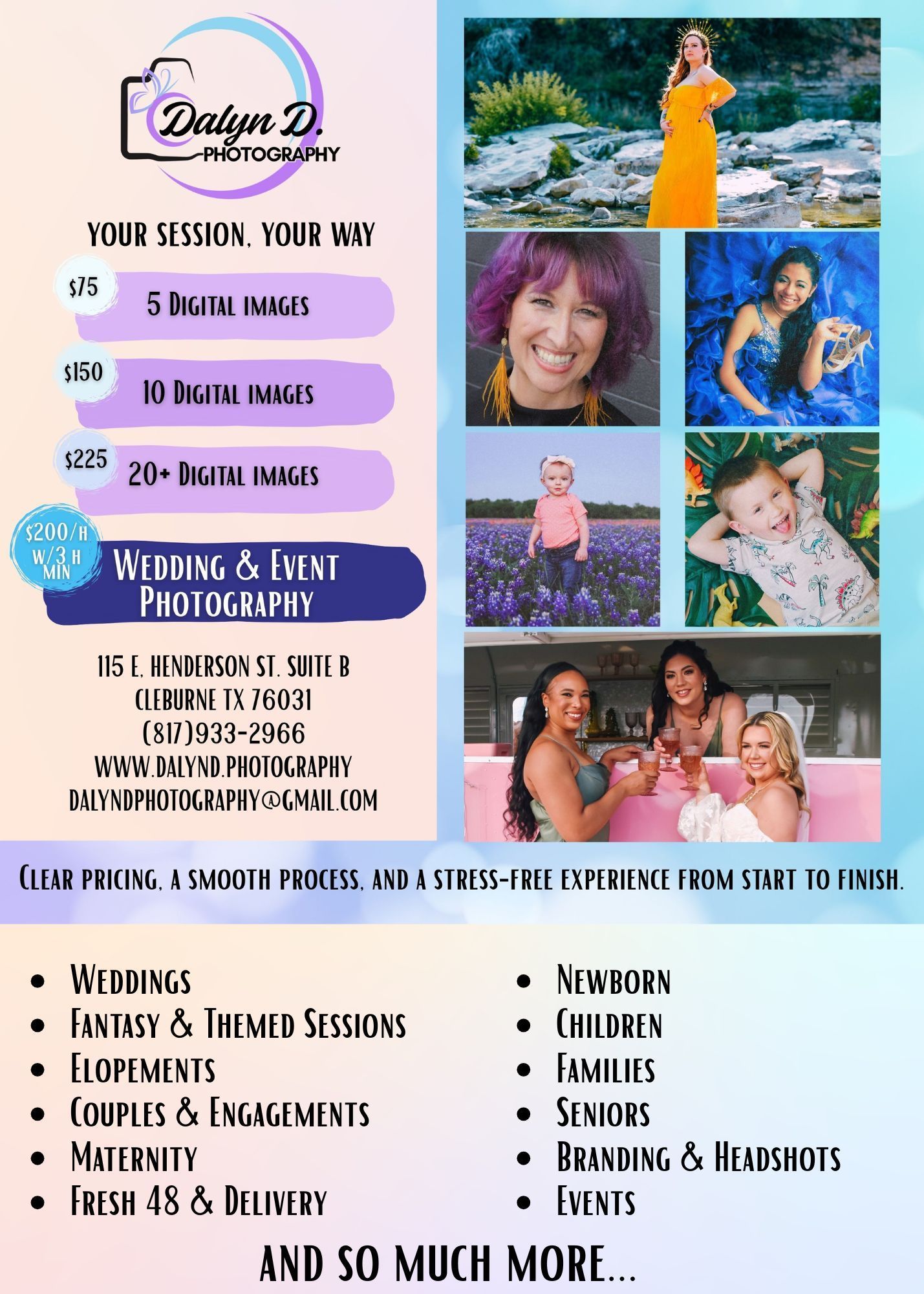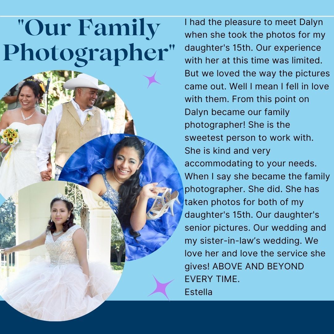 I’m Dalyn, and I’ve spent over 25 years capturing life’s real and meaningful moments through my lens. My love for photography started as a little girl flipping through my grandmother’s photo albums, falling in love with the way pictures can hold stories forever. These days, I get to create that same magic for families, couples, and little ones. I'm there, whether it’s a wedding, a newborn session, or a themed shoot full of creativity. For me, every photo is about freezing time so you can relive the laughter, feel the love, and see the magic for years to come.