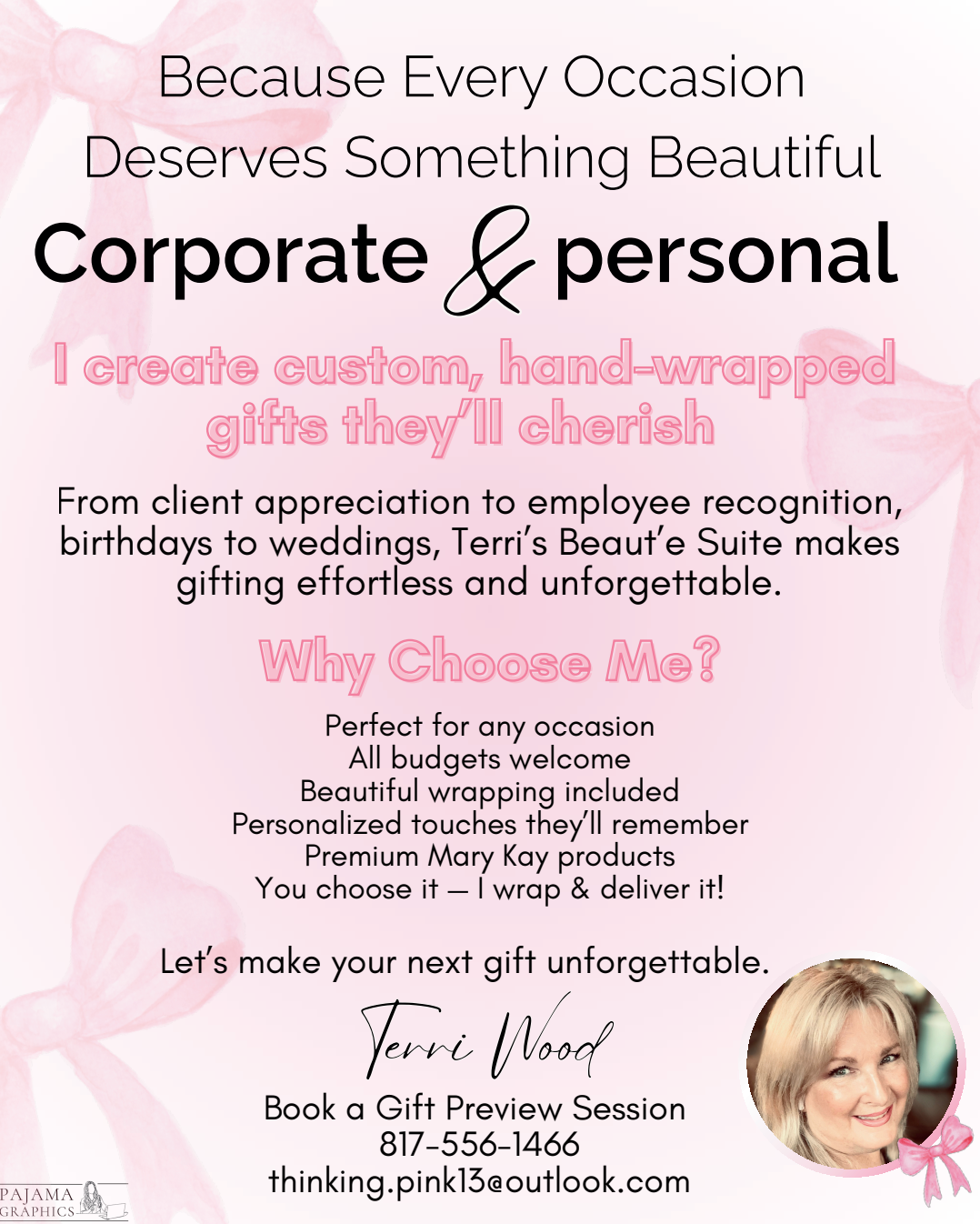 Terri’s Beaut’e Suite is all about helping you look and feel your best. From personalized skincare and makeup to thoughtful corporate gifts, I provide products and services designed to make you feel confident, cared for, and radiant. Every client is treated like family, and every gift is made personal.